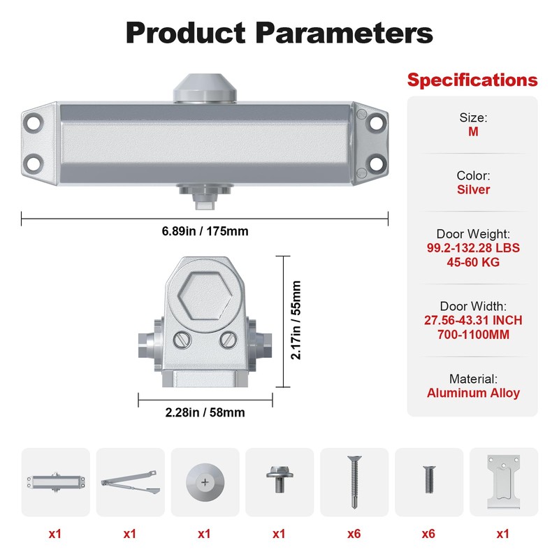 - DOOR CLOSER COMMERCIAL & RESIDENTIAL USE: The M size is suitable for door width between 27.56-43.31 inches /700-1100mm and door weight between 99.2-132.28lbs /45-60kg. It can be used in homes, garages, restaurants, hotels and other commercial places