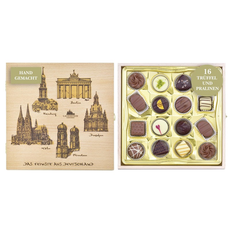 - Deliciously filled - The wooden box hides an exclusive selection of our fine alcohol-free truffle and chocolate specialities