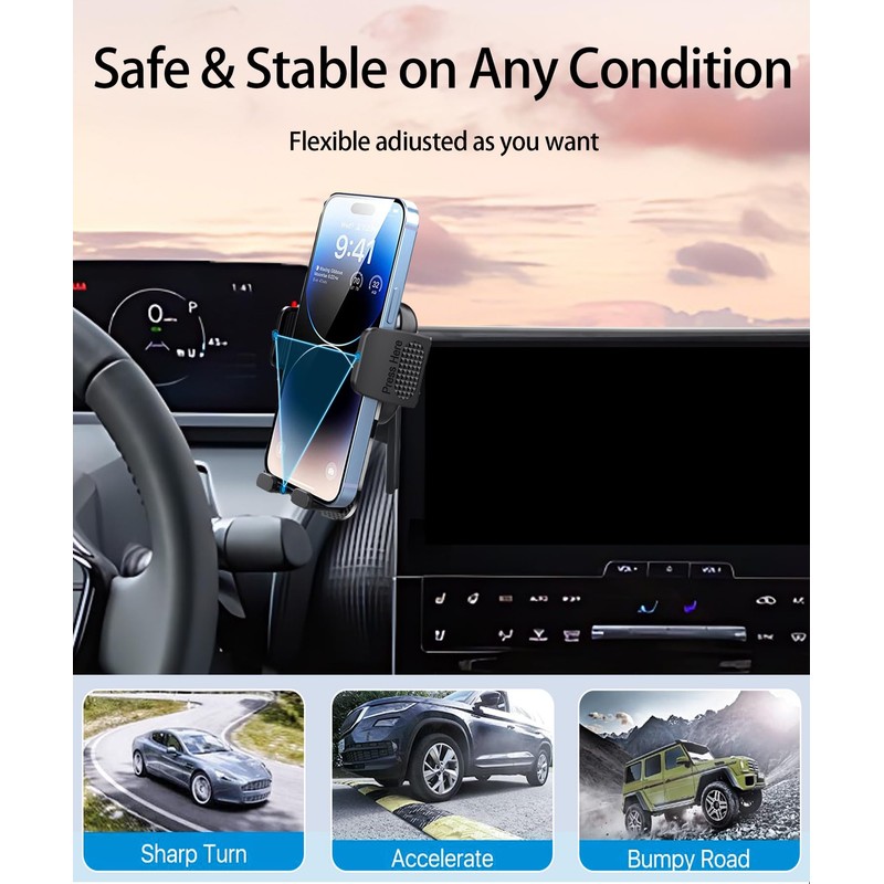 - STABLE MOUNTING: Maintains firm grip and stability during sharp turns, acceleration, and bumpy roads, with easy one-touch phone release button