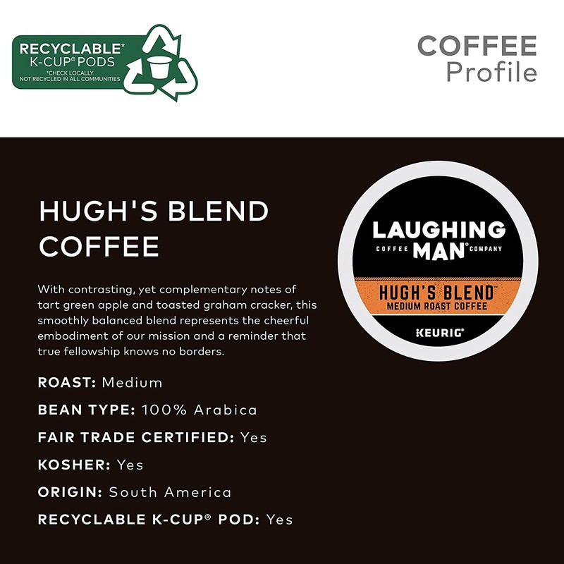 borders. Laughing Man Hugh’s Blend single-serve K-Cup pods are compatible with