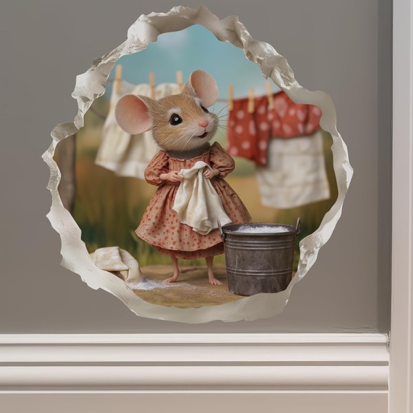 In the laundry room, a mouse takes care, Her tiny world, a sweet affair. A mouse hole mural, cute and neat, She hangs her laundry, soft and sweet. A decal charm, a cottagecore dream, With soap and cloths that brightly gleam. A perfect gift for mom, a home delight, This sticker brings whimsy day and night.