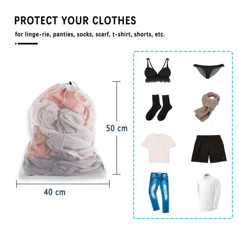 - Mesh material: laundry net is a bag made of breathable, porous material. The laundry net open woven net ensures strong permeability, allowing water to flow through the clothes and thus allows cleaning.