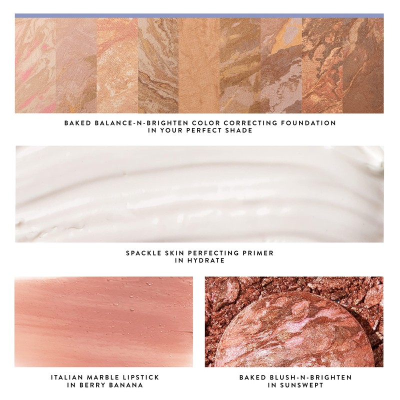 - THE ULTIMATE GLAM LOOK: The kit includes the Baked Balance-n-Brighten Color Correcting Foundation in your perfect shade, Baked Blush-n-Brighten Marbleized Blush in Sunswept, Spackle Skin Perfecting Primer in Hydrate, our creamy Italian Marble lipstick in Berry Banana, a warm cream with swirls of berry and sheer peach, and the Retractable Angled Kabuki Brush.