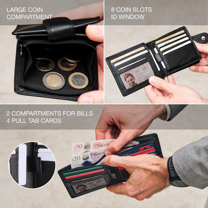 - 👔 Versatile Coin Pocket: Featuring a wallet with coin pocket size 4,5” x 3,75”, this rfid wallet combines convenience with elegance. It's not just a slim wallet but a complete organizer, offering features like a sim card holder and more.
