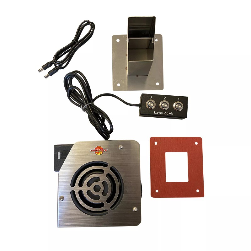 BBQ blower with large fan to start your pit quickly and keep it going! Includes Stainless fan housing, stainless adapter plate, gasket, fan and controller! Quicker starts! Makes it simple to keep the fire going, especially on stick burners. Works with out popular ATC-2 unit. Made by LavaLock® USA