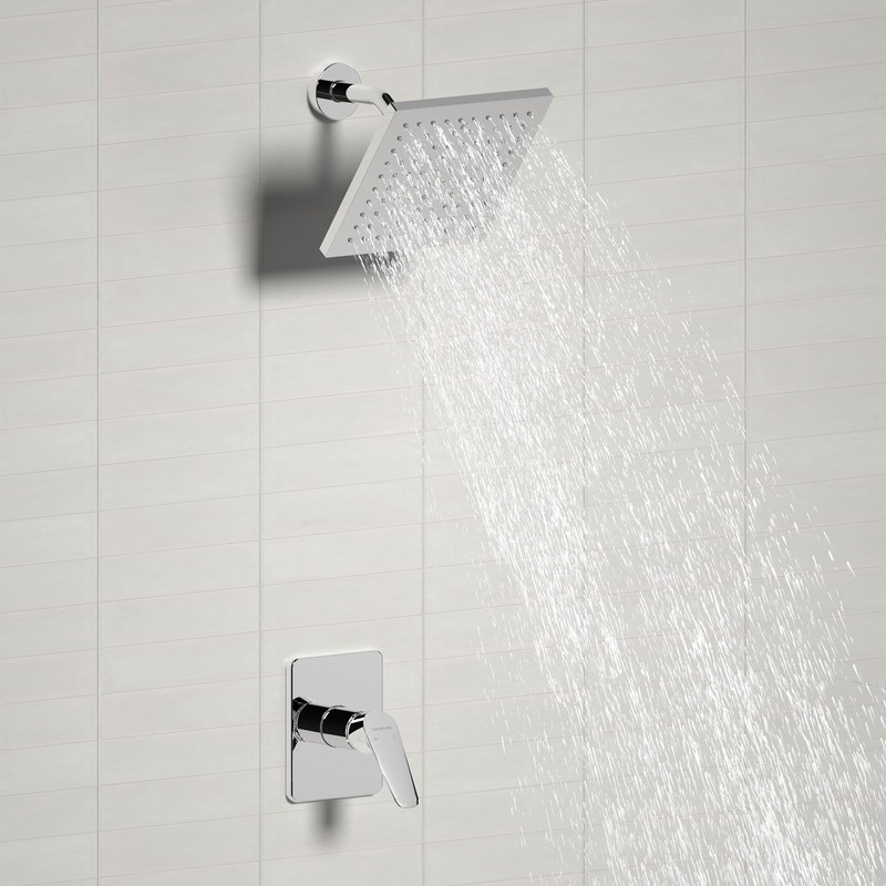 - EASY INSTALLATION: Equipped with NPT 1/2" connectors, it seamlessly integrates with U.S. plumbing standards and most shower trim kits. The package includes a sleek 8-inch square rain shower head(ABS), a wall-mounted shower arm, a precision-engineered solid brass rough-in valve, a stylish trim kit, a robust metal handle, and all essential hardware. This streamlined, single-function shower set is a top choice for both professional plumbers and discerning contractors