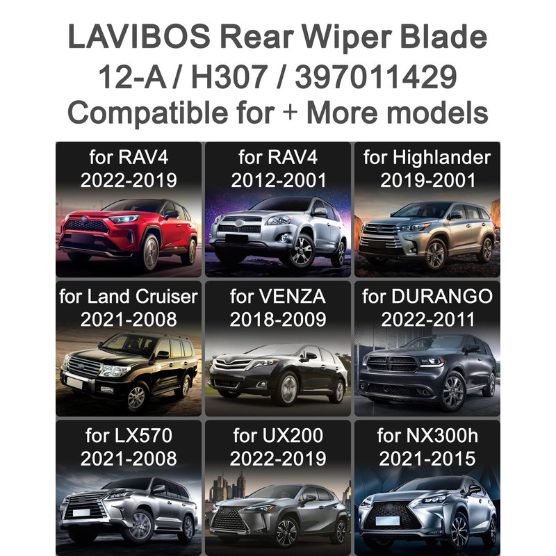 - VEHICLES FIT: LAVIBOS rear wiper blade for Toyota Rav4 2022-2019,Rav4 2012-2001 Highlander 2019-2001 Land Cruiser 2021-2008 Venza 2018-2009 Yaris 2019, 2011-2006 Matrix 2014-2009 /Scion xA 2006-2004 /Dodge journey 2000-2009 Durango 2022-2011 /Jeep Grand Cherokee 2013-2011 /Kia Forte Forte5 2013-2011 /Mazda 5 2017-2006 /mazda 6 2007-2004 /Endeavor 2011-2010 Mirage 2022-2014 Colt 2011-2004