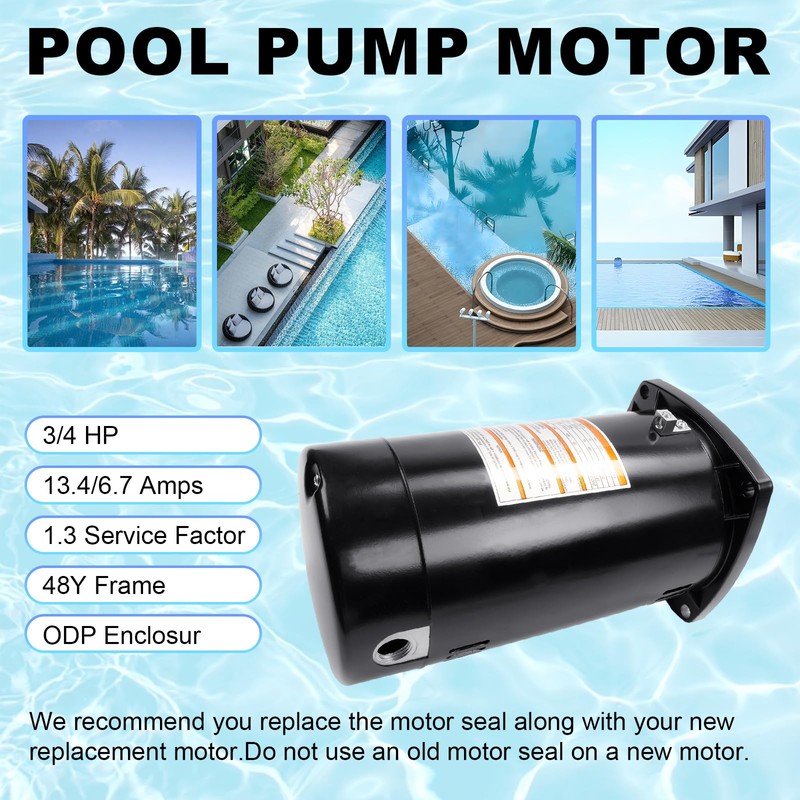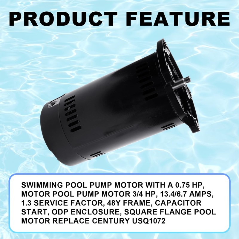 - 【Powerful Performance】Swimming pool pump motor with a 0.75 HP, motor Pool Pump Motor 3/4 HP, 13.4/6.7 Amps, 1.3 Service Factor, 48Y Frame, Capacitor Start, ODP Enclosure, Square Flange Pool Motor replace Century USQ1072