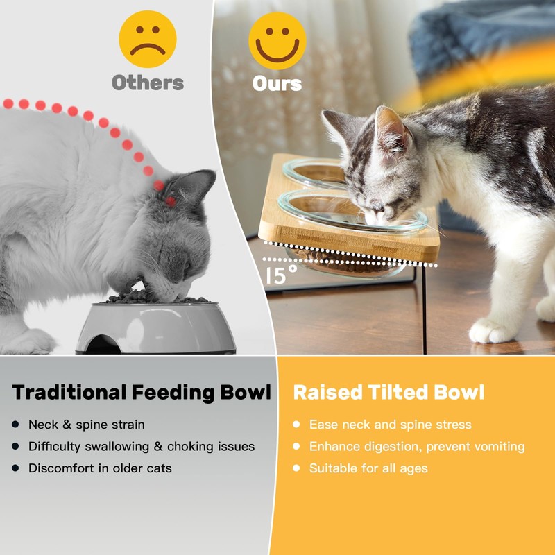 - [15° Tilted & Raised Design Eases Neck Strain and Aids Digestion]: Our glass cat food and water bowl features a 15-degree tilted and raised design, which relieves pressure on your pet's neck and back, making it easier for food to enter the mouth and aiding in digestion.