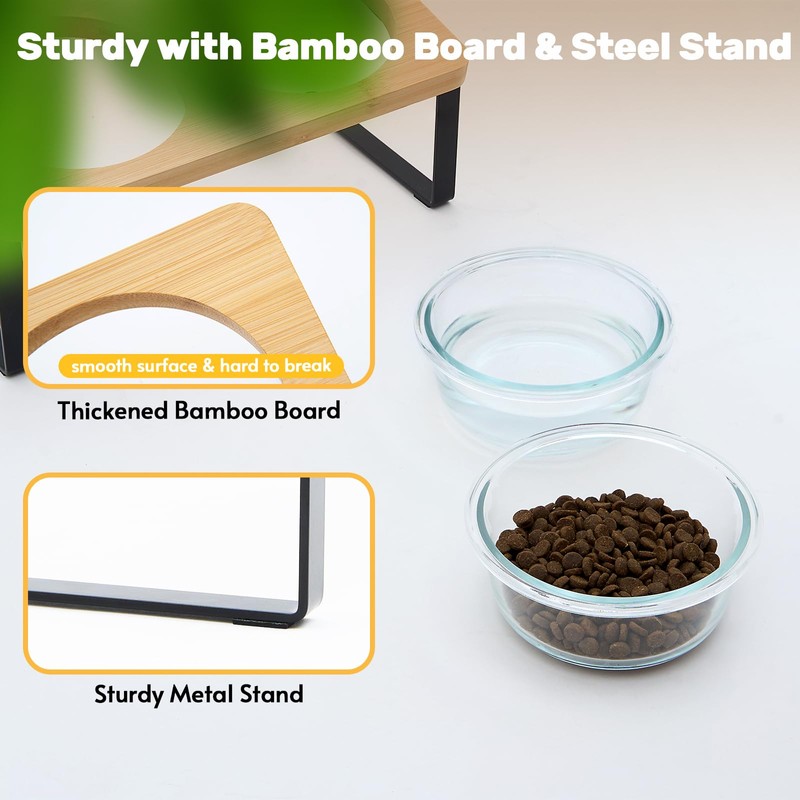Lawfery Elevated Cat Bowls, 15° Tilted Cat Food Bowl, Includes 2 Glass Cat Bowls, Bamboo Board, and Metal Stand for Cats and Puppies