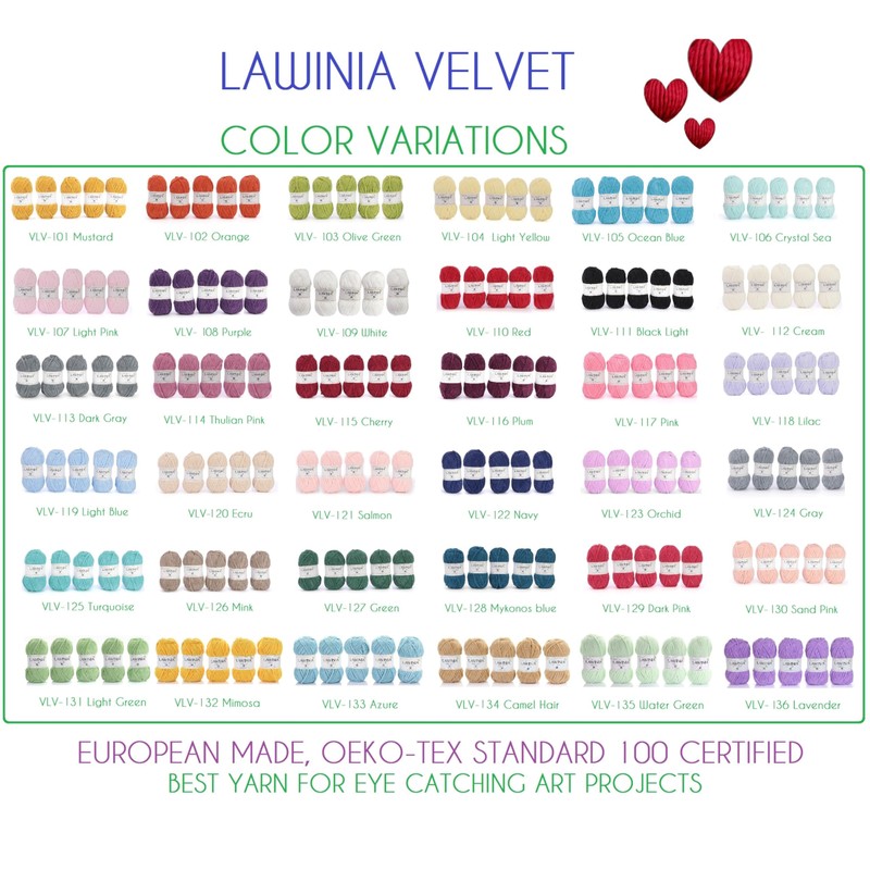 - Proven quality – this Hobbii wool meets human ecological requirements. The super soft, plush wool from LAWINIA Velvet is Oeko-Tex Standard 100 certified and tested for harmful substances. In addition, LAWINIA chenille yarn it vegan and contains no animal fibres. !