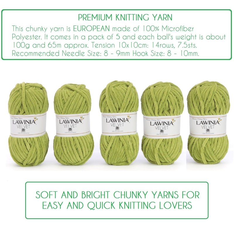 - Premium Chenille Wool for Crocheting (Olive Green): This chunky yarn is made of 100% microfiber polyester. It comes in a pack of 5 and each ball weighs approx. 100 g and 65 m. Tension sample 10 x 10 cm, 14 rows 7.5 stitches, recommended needle size: 8 - 9 mm, hook size: 8 - 10 mm.