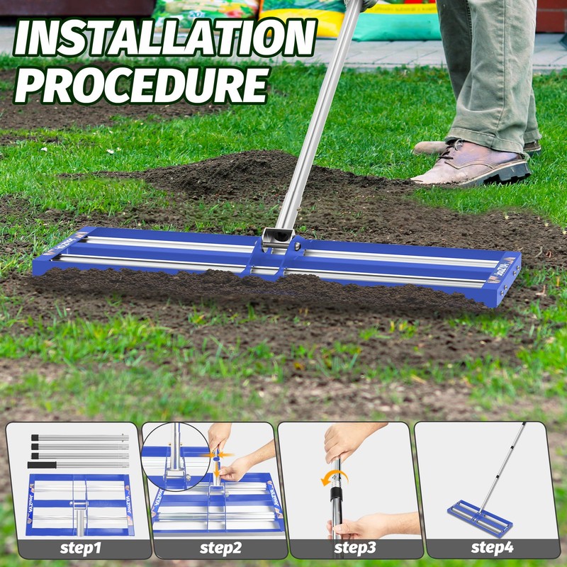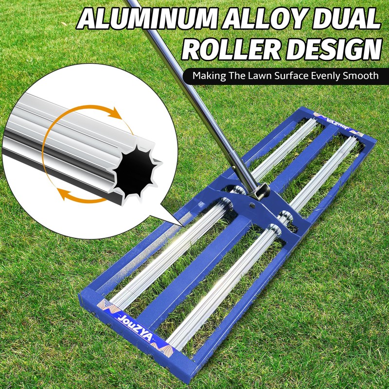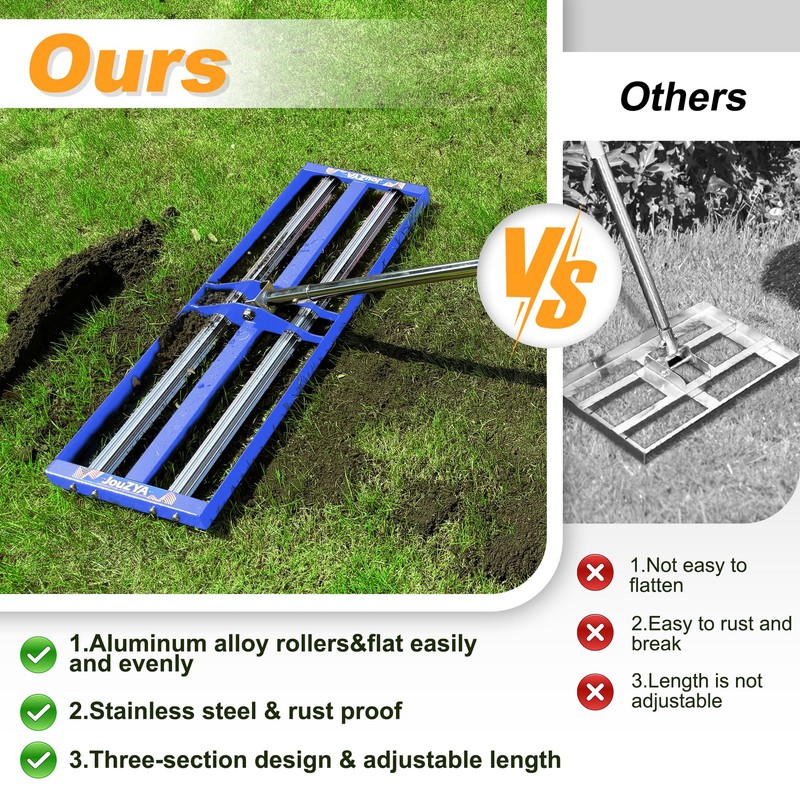 - Upgraded Base with Aluminum Roller: Achieve smoother, more efficient soil leveling with our upgraded lawn leveling rake, featuring a reinforced base enhanced by a high-quality aluminum alloy roller. Designed to glide effortlessly across your lawn for optimal results