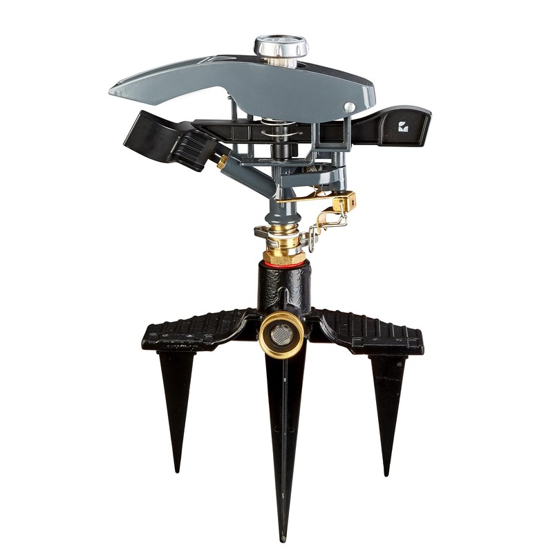 Lawn Pulsating Impact Sprinkler 300004, Heavy Duty, Adjustable to 360 Degrees on 3-Prong Metal Step Spike by New England Garden Tools
