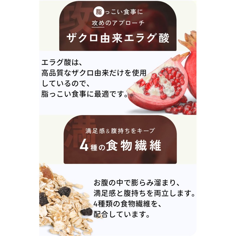 - 【ダイエッター話題の成分1】 脂っこい食事にアプローチしたエラグ酸を配合。1包でいちご15個分のエラグ酸が摂取できます。 さらに、エラグ酸の中でも高品質なザクロ由来のものだけを使用した贅沢な配合となっています。