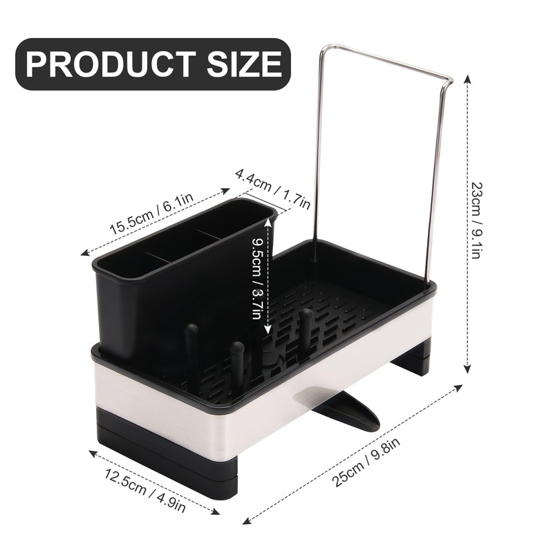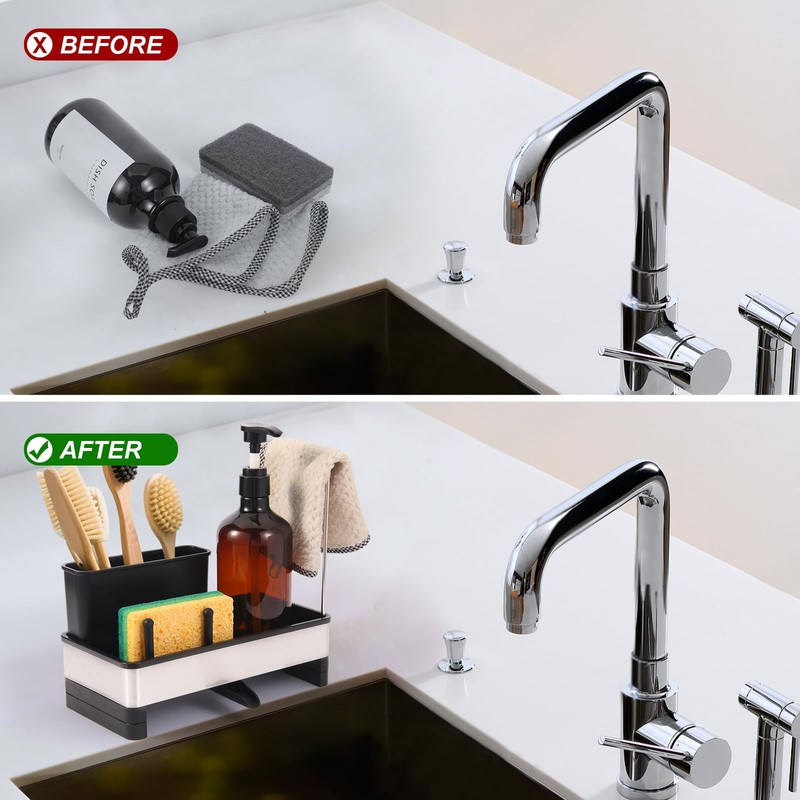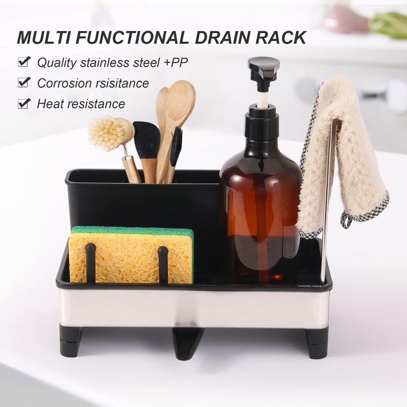 - All-in-1 Space-Saving Design: Compact unit holds kinds of kitchen essentials: detergent bottle, sponge, sink stopper, brush, and dish cloth. Declutter your sink area with the countertop organizer—ideal for small kitchens or households craving minimalist storage.