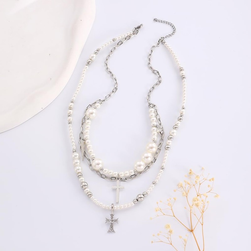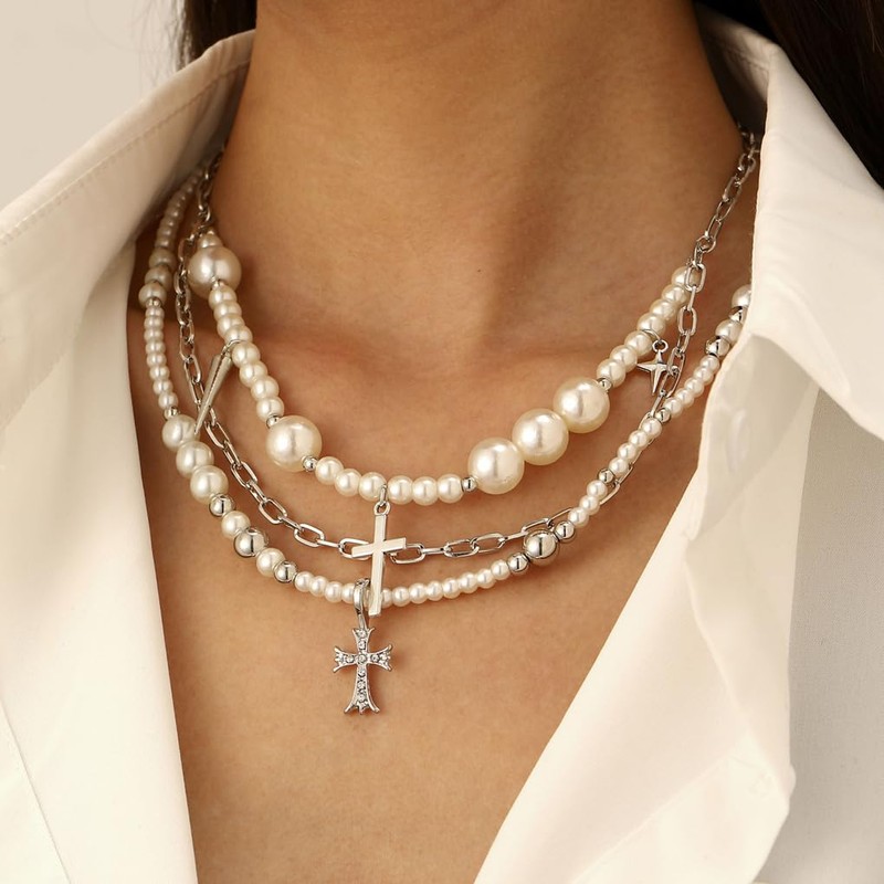 - Layered Small Cross Pendant Pearl Necklace Set:Think goth layered small silver cross imitation pearl chokers—tiny silver crosses, dainty fake pearls, and that edgy goth flair, all layered up. Then there’s exquisite silver cross pendant bead chain stack collarbone necklaces for women—stacked to hit just right at the collarbone