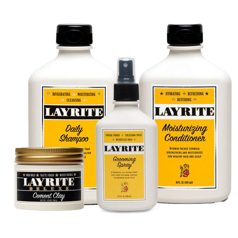 The Layrite Cement Clay Hair Bundle includes everything you need for ultimate hair styling, including the high hold, water-based Layrite Cement Clay, Daily Shampoo, Moisturizing Conditioner, and Grooming Spray. The Layrite Cement Clay is a versatile styling clay that delivers a clean, matte finish with an intense hold that allows you to reshape and rework your style throughout the day. Its pliable formula grips and binds individual hairs together to thicken and shape, creating dry, messy textured looks or volume with extreme fullness and definition. The Daily Shampoo is an energizing shampoo that leaves your hair clean, healthy, soft, and ready to style, while the Moisturizing Conditioner strengthens and moisturizes for healthy hair and scalp without weighing down your style. The Grooming Spray is an all-in-one hairspray that creates volume and texture, assists with shine and hold, and can be used as a pomade primer or to give roots an extra boost of volume for a perfect pomp. What are the benefits and features of Layrite Cement Clay Hair Bundle? Layrite Cement Clay delivers an intense hold with a clean, matte finish that lasts all day. Daily Shampoo leaves hair clean, healthy, soft, and ready to style. Moisturizing Conditioner strengthens and moisturizes for healthy hair and scalp without weighing down your style. Grooming Spray creates volume and texture, assists with shine and hold, and can be used as a pomade primer or to give roots an extra boost of volume for a perfect pomp. Layrite Cement Clay is versatile and can be used to create dry, messy textured looks or volume with extreme fullness and definition. Layrite Cement Clay is water-based and washes out easily without leaving build-up behind. Layrite Daily Shampoo is energizing and suitable for all hair types and lengths. Layrite Moisturizing Conditioner is vitamin-packed and suitable for all lengths and textures of hair and those with dry scalp. Layrite Grooming Spray is weightless, water-soluble, and has a clean and fresh scent. Who is Layrite Cement Clay Hair Bundle for? This bundle is perfect for anyone who wants to achieve ultimate hair styling with a versatile styling clay, energizing shampoo, moisturizing conditioner, and all-in-one grooming spray.