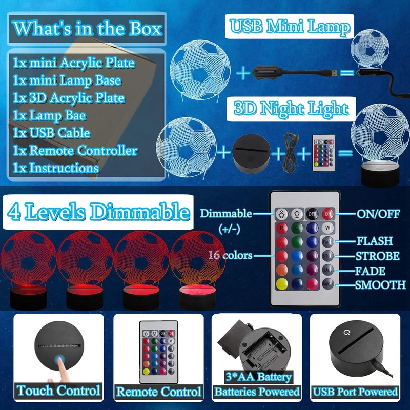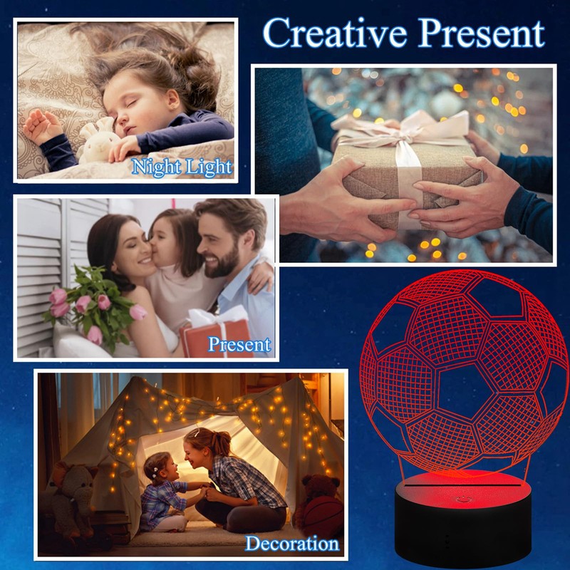 - ➜4, 【Creative Gift for Someone】Each 3D night light comes with a mini version USB lamp, as a gift for the buyer. And, it is a creative gift for boys/girls/woman/man/children/teenagers/adults. It is one of the best choices for gifts, such as birthday gifts, Christmas gifts, New Year gifts, graduation gifts, wedding gifts, anniversary gifts and so on