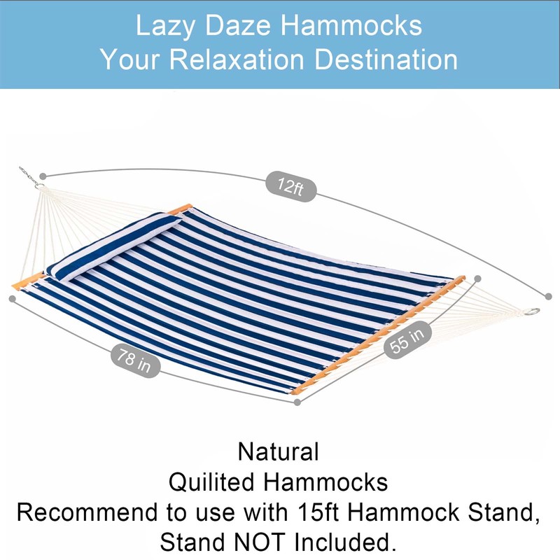 Lazy Daze 12 FT Quilted Double Hammock with Spreader Bar, 2-Person, 450 lbs Capacity, Blue White