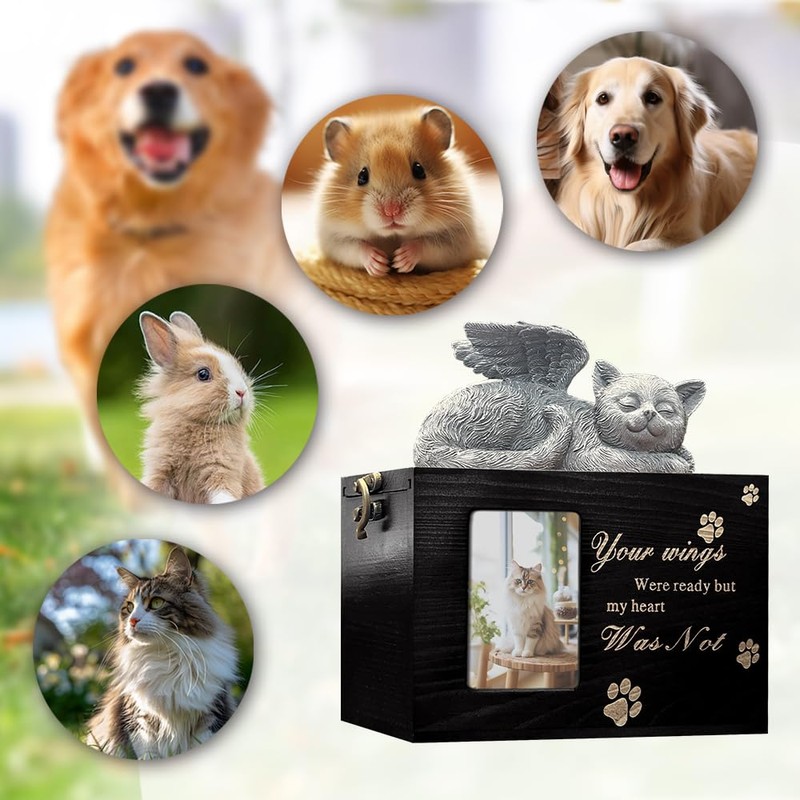 LAZYESTHER Cat Urns for Ashes with Picture, Black Pine Wood, Angel Pattern, Pet Memorial Products, Pet Urn, Cat Urn