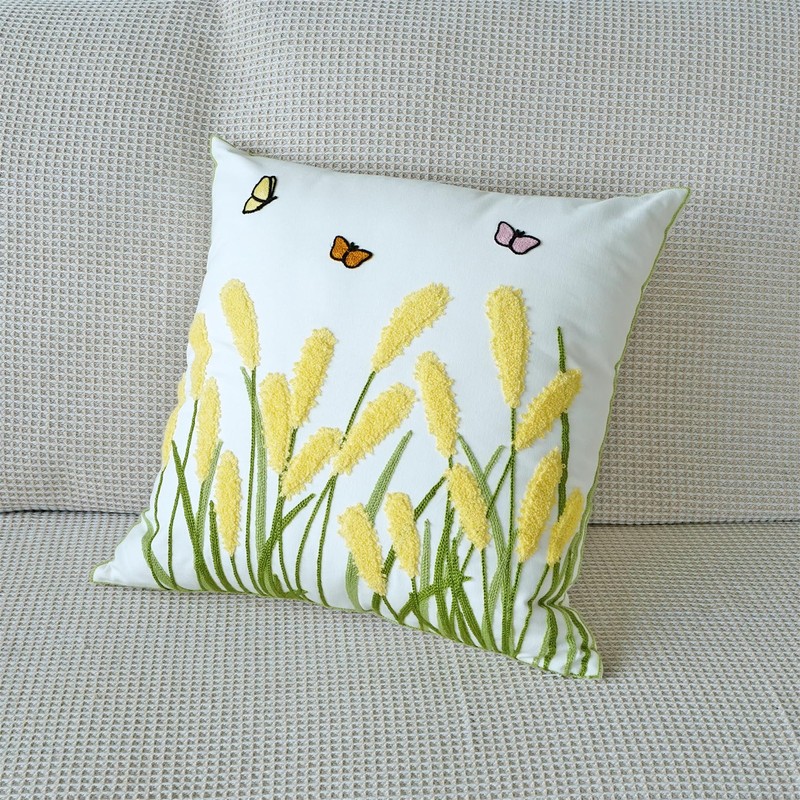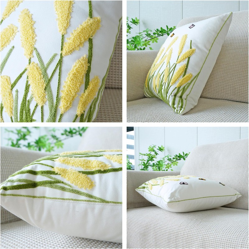 LB Embroidered Pillow Covers 18x18 Inch Set of 2, Reed Pampas Grass with Green Leaf and Butterfly Yellow Floral Throw Pillow Covers Decorative Pillow Cases for Couch Living Room Sofa Bed Cushion Cases