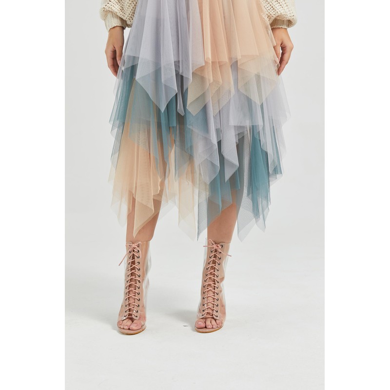 Women's Tulle Skirt Formal High Low Asymmetrical Midi Tea-Length Elastic Waist Skirts,This tulle skirt have three colots: grey,chanmpagne,green.