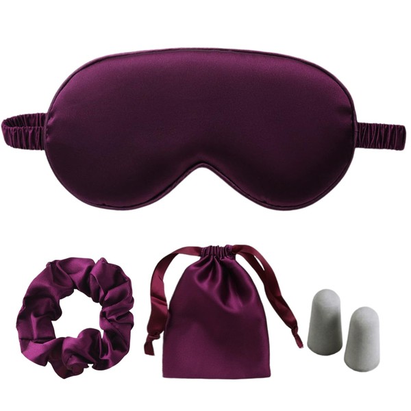 LCBD Silk Satin Sleeping Eye Mask, Dark Purple Sleep Eye Night Blindfold for Women and Men, Eyeshade Cover With Satin Hair Scrunchies and Ear Plugs, Wedding Bridesmaid Gift