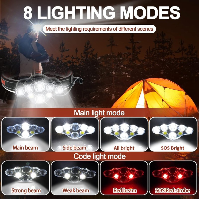 - 【8 LIGHT MODES】: LED headlamp control 8 lighting modes through 2 buttons: high light, side light, full light, SOS strobe, 2 light (strong), 2 light (weak), red light, SOS red light. It will meet your various needs.