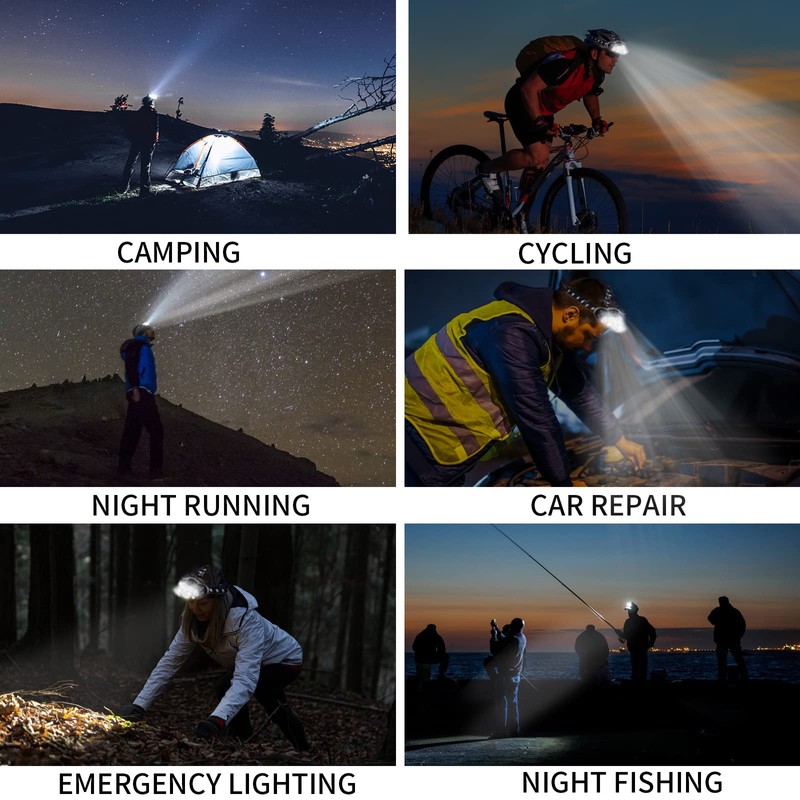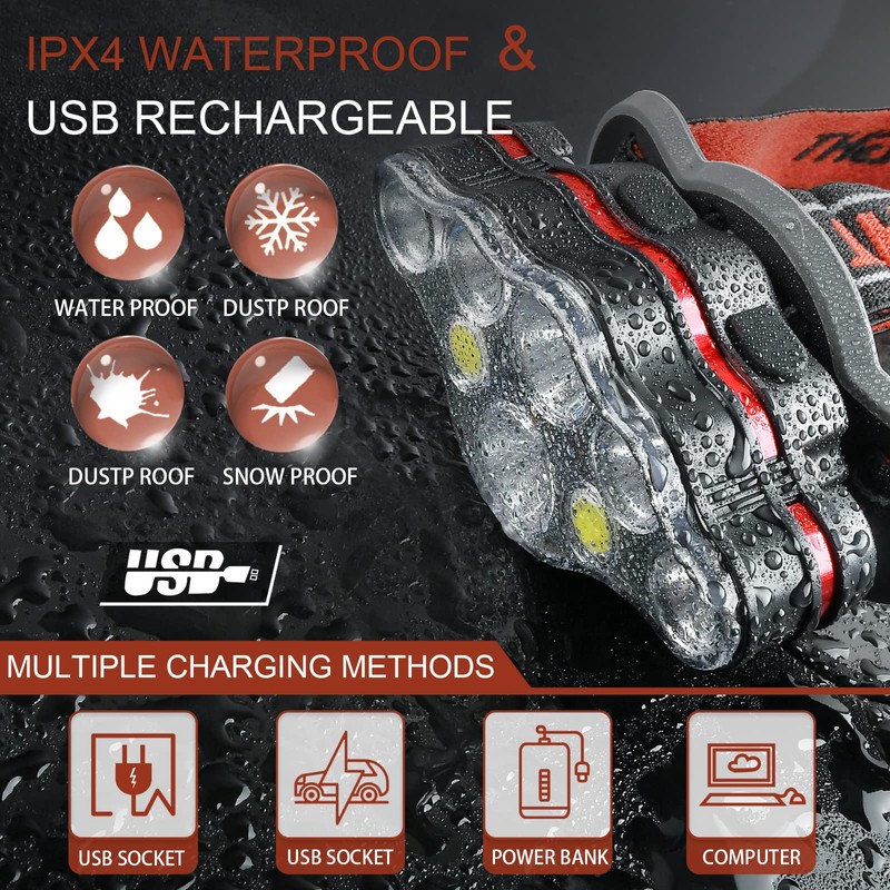 - 【WATERPROOF & RECHARGEABLE HEADLAMP】: The head lamp has passed the IPX4 waterproof certification. And it can work for 4-10 hours (depending on the mode) after fully charged.