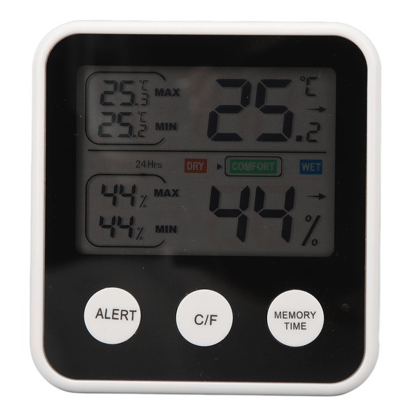 1、[HD LCD Display] Our digital temperature humidity meter gauge is with HD LCD display and is eye catching and easy to see. 2、[Large and Bold Fonts] Digital display hygrothermograph meter is also with large and bold font so no matter the elder or the young, they can simple get the accurate number. 3、[45° Support Frame] LCD thermometer hygrometer adopts scientific 45° view angle frame and you can fold the support frame at will. 4、[Realtime Monitoring] You can know and do realtime monitoring of the meter values and record the all time or 24 hours temp humidity value for the maximum or minimum number. 5、[Environment Friendly ABS Housing] This digital temperature humidity meter is made of ABS housing and environment friendly.