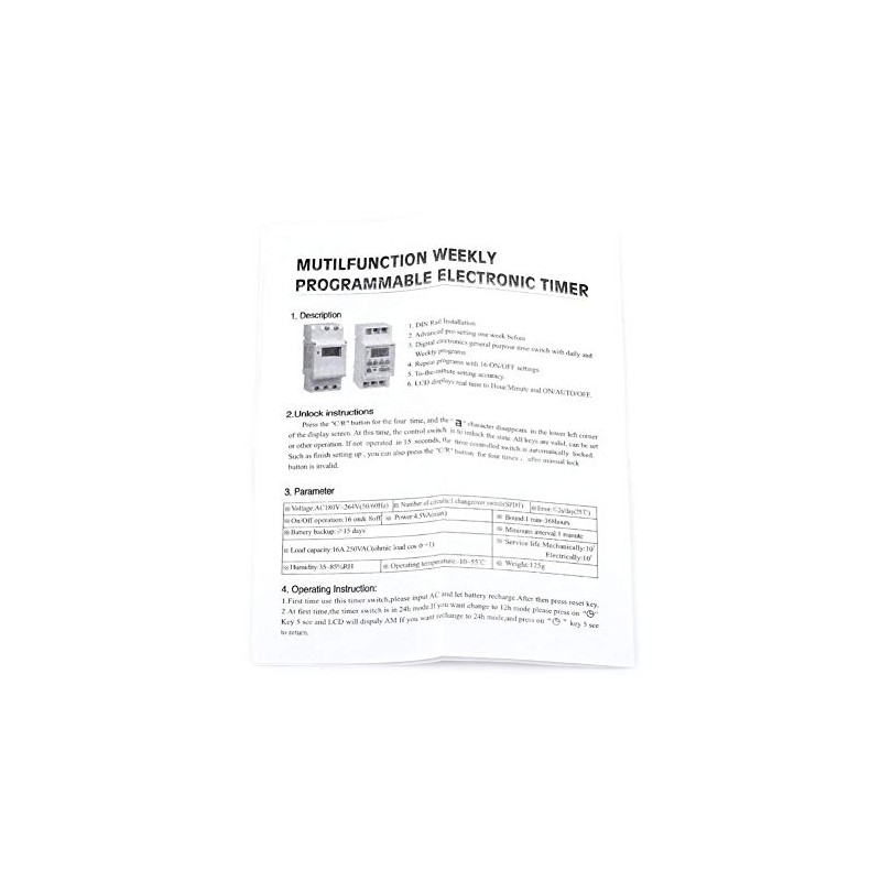 - 【About Digital Time Switch】Input Voltage: AC / DC 12V, AC / DC 24V, AC 110V (optional); Contact Rated Voltage: AC 180V - 264V (50 / 60Hz); Load Capacity: 16A 250VAC (resistive load); On/Off Operation: 16/16 OFF (manual/automatic); Display: LCD; Power: 4.5VA (max); Error: ≤2 seconds / 2 Day (78°F (25°C) ); Installation Method: DIN Rail (sold separately); Biding: 1 minute to 168 hours; Working Temperature: -10 to 55 °C; Size: 86 x 36 x 65 mm; Quantity: 1