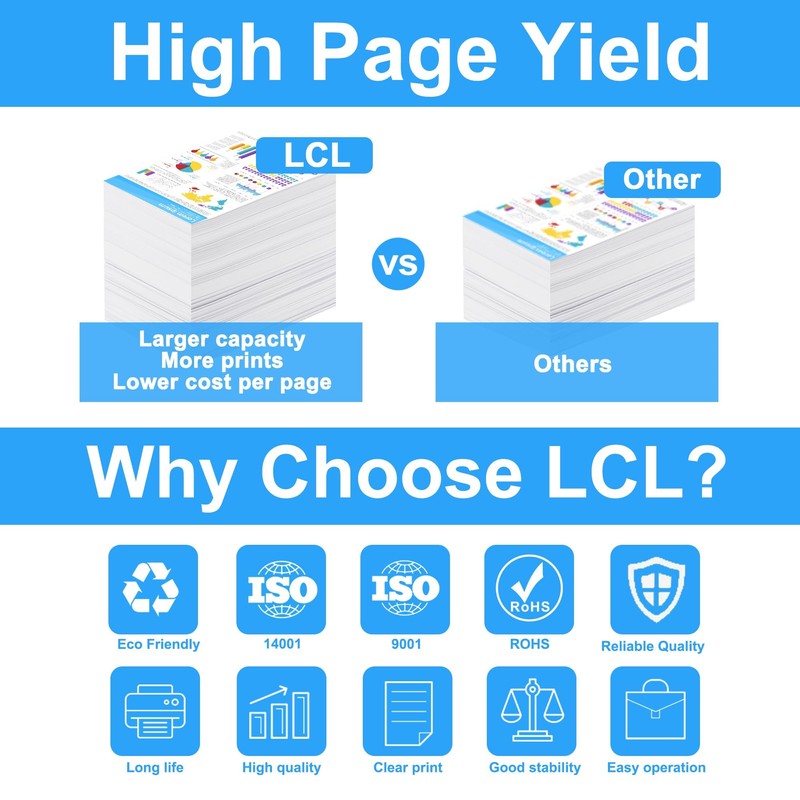 - Condition: Our compatible cartridges from ISO 9001/14001; STMC; CE; ROHS Certified factory.LCL compatible supplies provide high-quality raw materials to ensure printing effect, and strict management ensure the stable quality