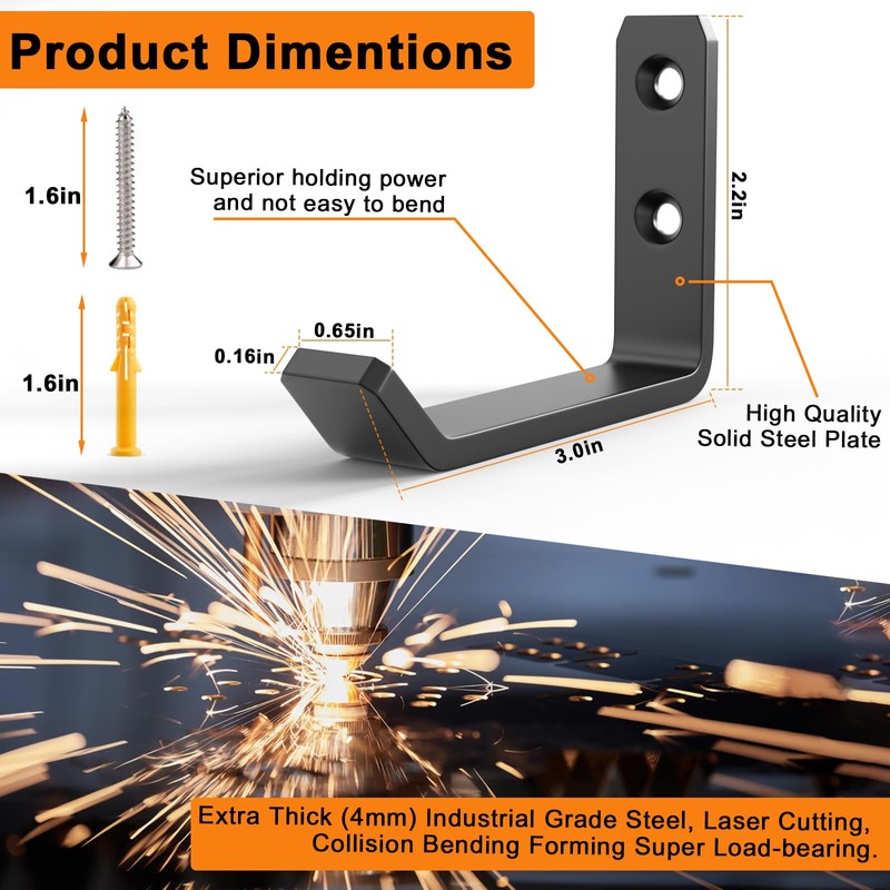 Heavy Duty Hook Store irregularly shaped jacks on the tool wall. Make the workspace more organized. Thickened steel plate (4mm) Laser cutting; Stamped and formed, no welding, stronger.Material: High quality industrial grade steelPackage Contents: Hook 6 304 stainless steel screws 12 Diameter 0.24 inch expansion tube 12