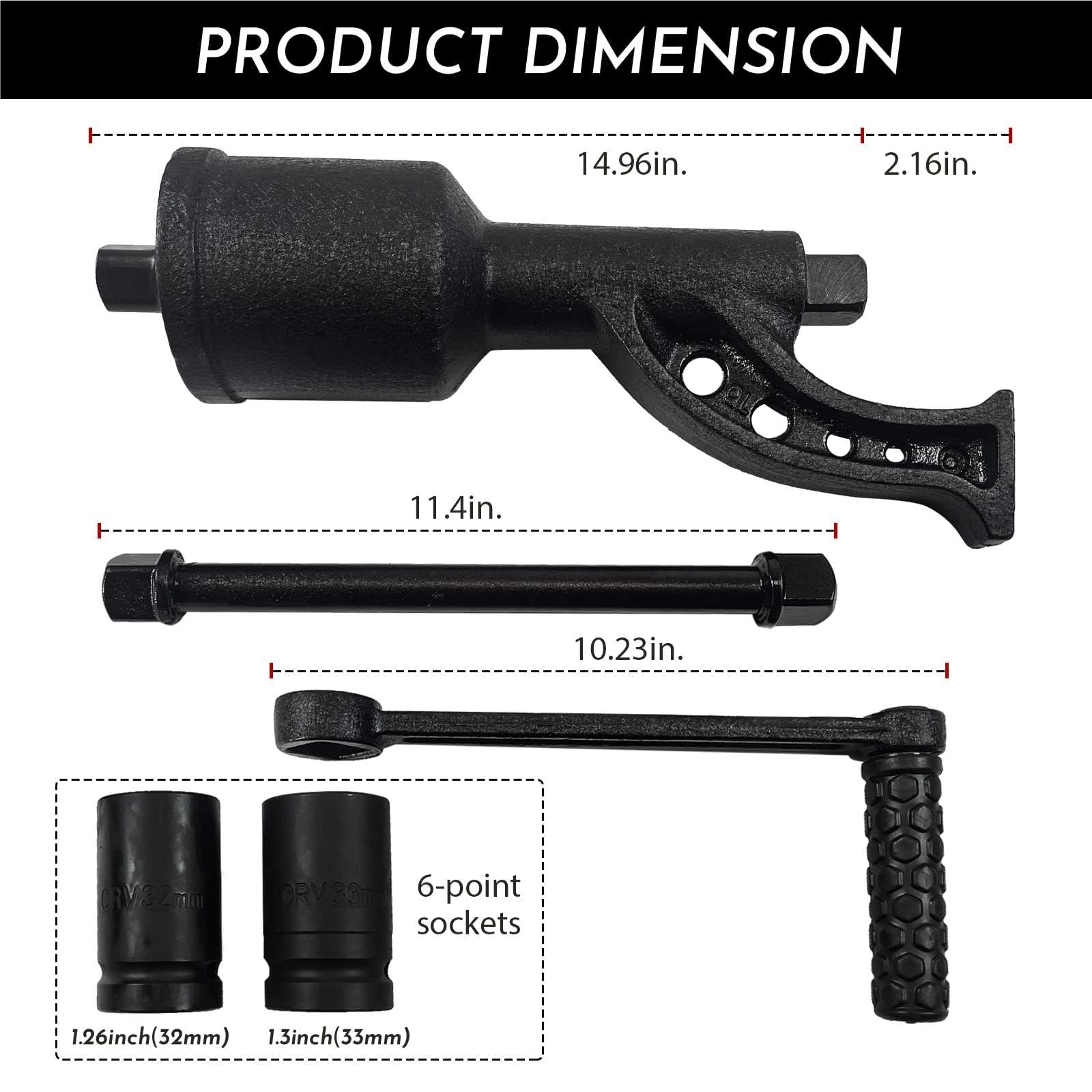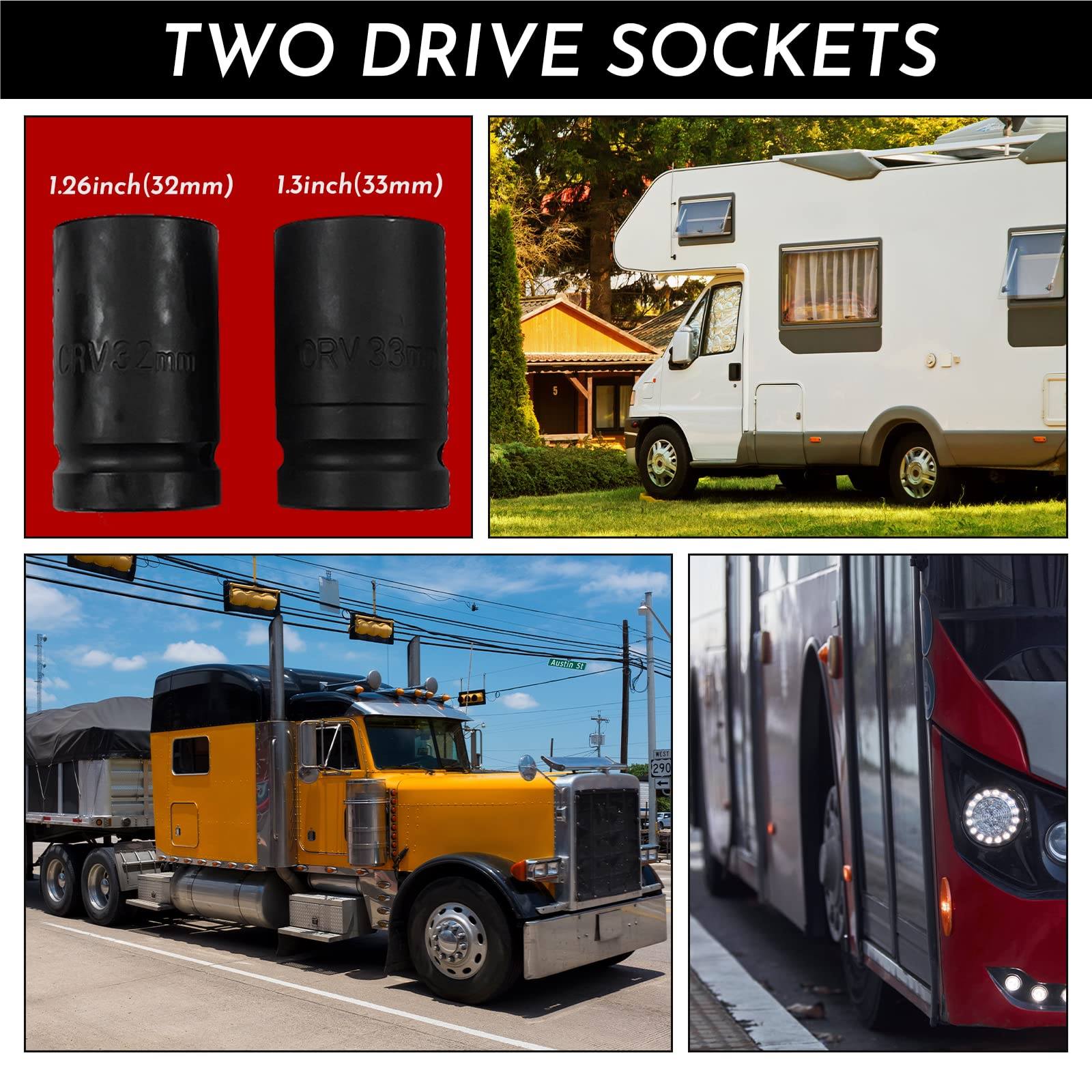 High Performance: Maximum torque output: 5800 NM; transmission ratio: 1:78; this nut wrench includes 1x Long Bar,1x Wrench,1x Rocking Bar, 1x32mm (1.26 inches) socket, 1x 33mm (1.3 inches) socket.