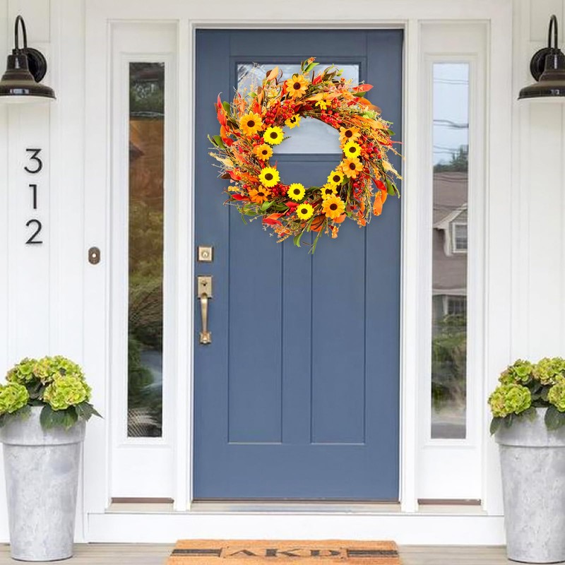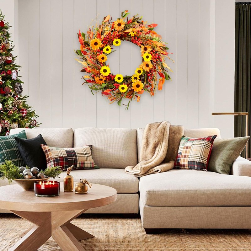 Lcyunnvli Fall Wreath 24" Yellow and Orange Daisies Autumn Wreaths for Front Door Leaves Berries for Thanksgiving Day Harvest Festival Celebrations Window Wall Wedding Farmhouse Festival Decor