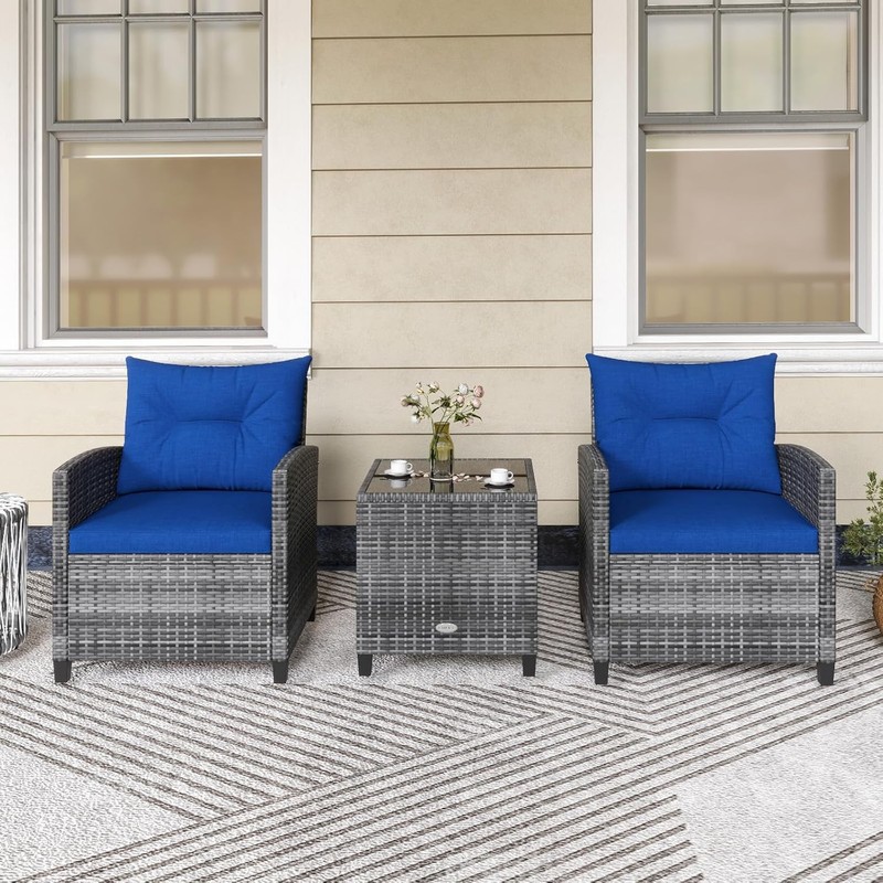 - [BEAUTY -DECORATION FOR HOME] This 3 piece patio set is available in 6 colors. Both artistic and practical, this wicker patio furniture is a great decoration for your home It can be used on the patio, balcony, poolside, garden, front porch or backyard. It not only serves as a indoor & outdoor furniture but also makes a thoughtful gift for family or friend.