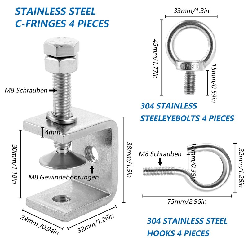 Package includes: tiger clip x4+M8 hanging ring x4+M8 hooks x4