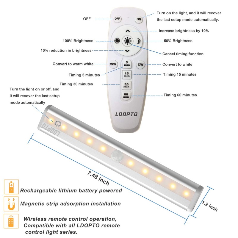 - UPGRADED 2 CONTROL METHODS: Compared to traditional Remote Control cabinet light , LDOPTO led cabinet light has 2 Control Methods - Remote Control and Touch Control. such as turning on/off the light, adjusting the lights color, brightness and timing, etc. It if you need bright pure white light or Warm light - the LDOPTO Remote Controlled LED Bar Light has is covered.And when the remote is not around you, great response touch switch easily achieve turn on/off the led cabinet light by light touch.