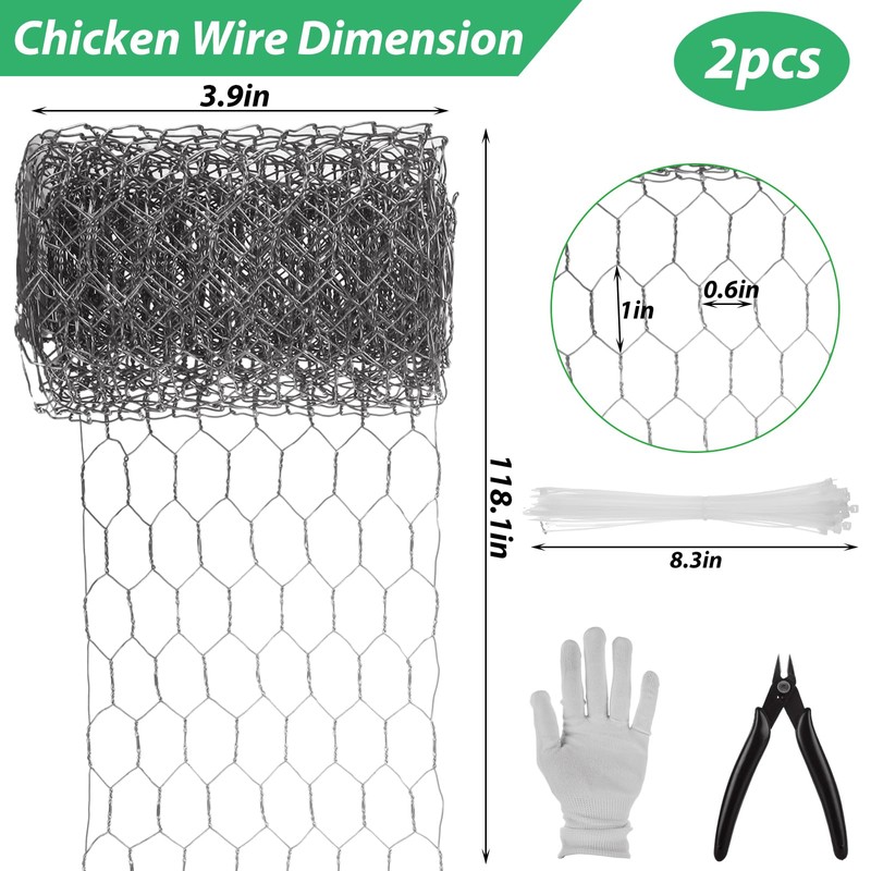 LDXDRU 2Pcs Chicken Wire Fencing Mesh 118" x 3.9" Chicken Wire Mesh Chicken Wire Roll Chicken Wire Fencing for Floral, Chicken, Pet, Rabbit, with Cutting Pliers and 1 Pair Gloves