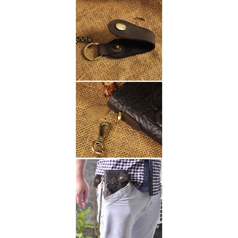 Le'aokuu Mens Genuine Leather Bifold Wallet Organizer Checkbook Iron Chain W1088 (W1088 Tiger Dark Brown)