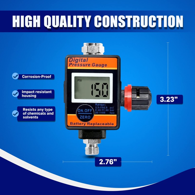 - Accurate Digital Gauge: Easily adjust pressure up to 150 PSI with our digital air pressure regulator. Its easy-to-read display ensures you maintain the exact pressure throughout your project.