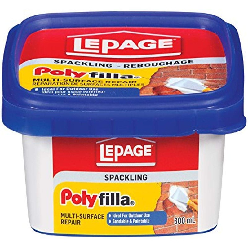 LePage Polyfilla Multi-Surface Repair is a ready-to-use, multi-purpose patching compound that's ideal for fixing minor imperfections. This versatile compound bonds to a variety of surfaces inside and outside the home, including plaster, drywall, wood, brick, concrete, and masonry. Use LePage Polyfilla Multi-Surface Repair to fix small nail holes, hammer dints, rough wood grain, cracked paint, chipped concrete block, and more. Our patching compound is also incredibly durable. It won't crack and it's highly water-resistant, so it's suitable for high-humidity applications in the kitchen, bathroom, and outdoors. Plus, LePage Polyfilla Multi-Surface Repair is sandable and paintable, making it easy to blend into your home's surroundings.