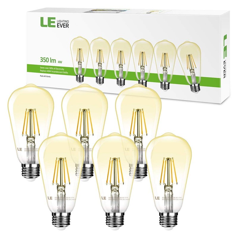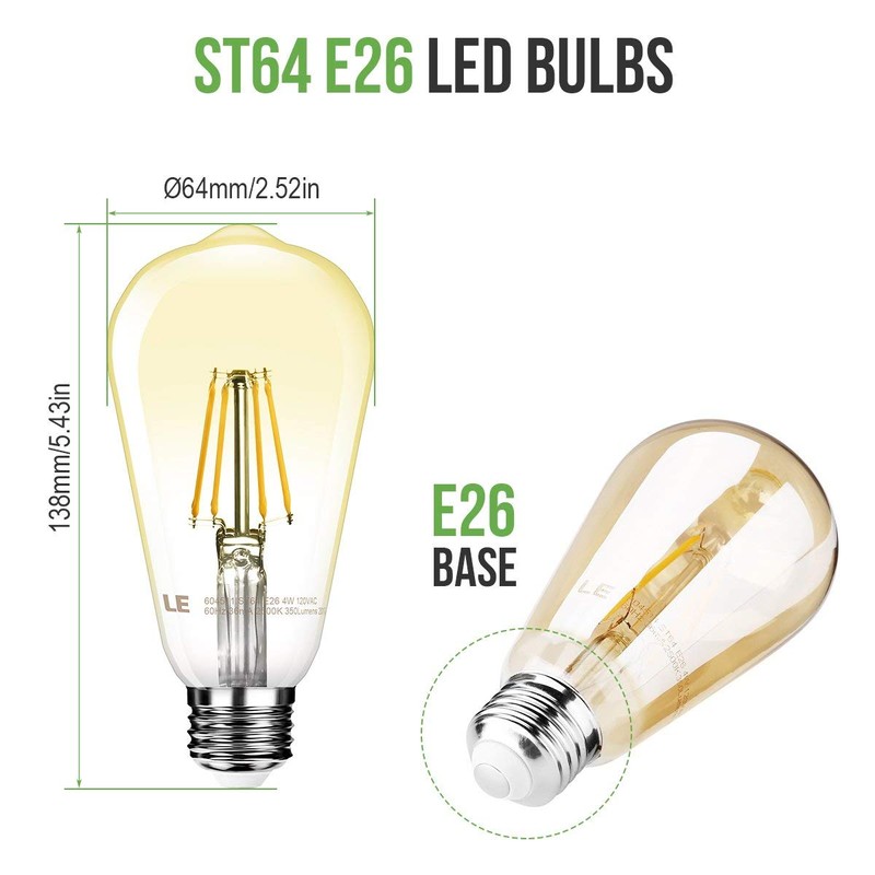 LE ST64 E26 Vintage Edison LED Bulbs, Dimmable, 4W 350 lm, 40W Incandescent Equivalent, Wide Beam Angle, Pack of 6