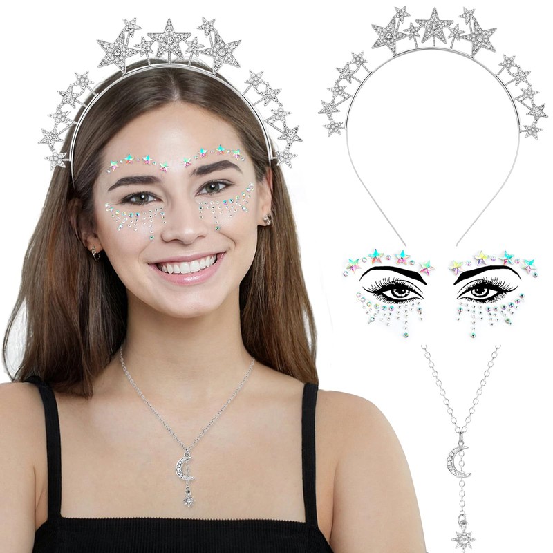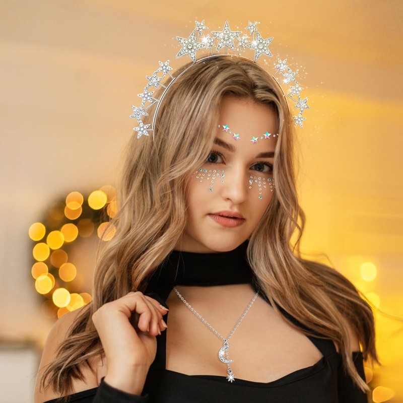 - What you get: This star headband set for women and girls includes a shimmering headband decorated with star-shaped rhinestones, a pair of eye face stickers with diamonds and an exquisite necklace. The headband with stars shines in the light with an enchanting shine and gives the overall look an elegant and mysterious touch.