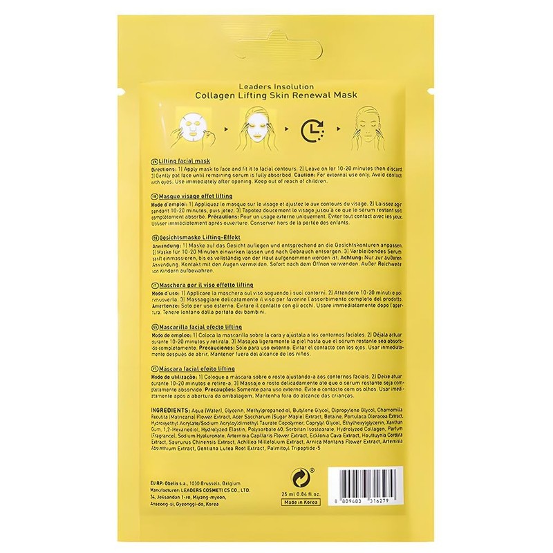 • LEADERS QUALITY ASSURANCE ?Manufactured in South Korea by Leaders, a renowned skincare brand with its own R&D center and production facilities, each product undergoes rigorous testing to ensure the highest quality and effectiveness. Leaders Insolution Collagen Lifting Masks are easy to use: Cleanse and prep skin with toner. Remove mask from the pouch and fit to facial contours. Leave on for 10-20 minutes for optimal results. Gently massage extra serum into face and neck until fully absorbed.