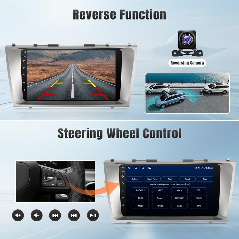- 【1280P AHD Rear Camera & SWC】This screen for toyota camry android auto with backup camera, 170° ultra-wide angle, waterproof design, help you drive safer and park easier; carplay for 2007 toyota camry radio supports the steering wheel control of the original car. After correct wiring, learn the steering wheel buttons then you can switch songs adjust the volume and answer the phone through the steering wheel