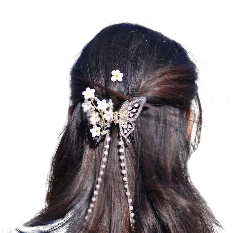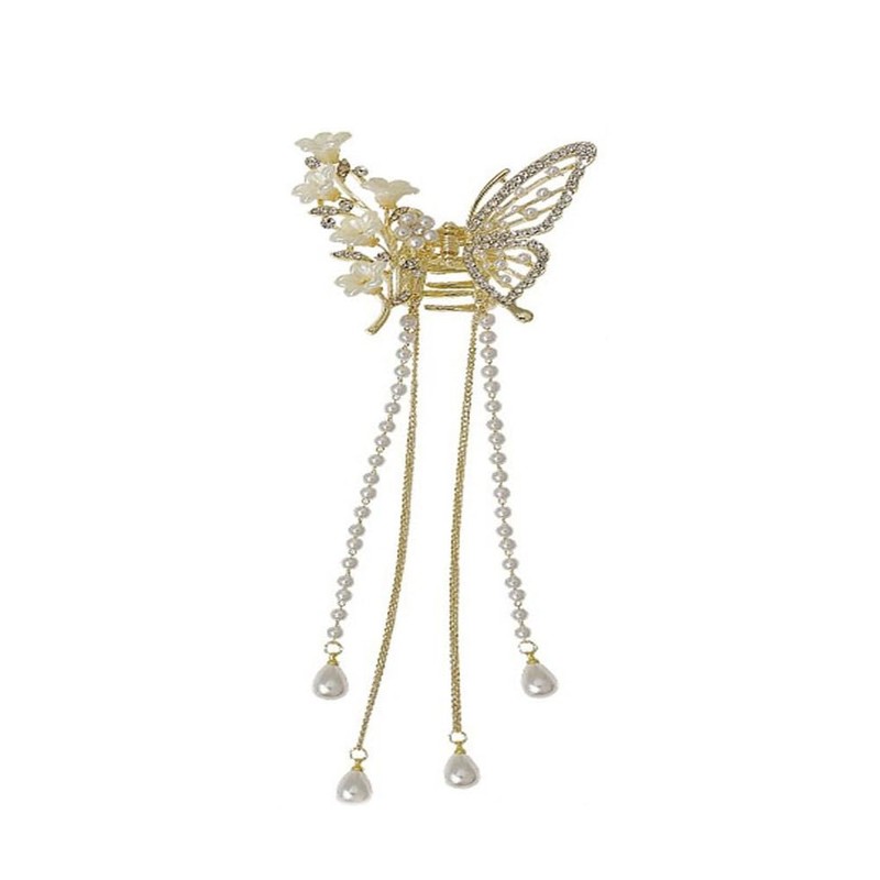 - The hair claw clip keeps your hair tidy when you are in cooking, washing your face, showering, doing sports, makeup or else. Fashion hair claw clip is made of pearl and alloy material. It's designed with a glitter butterfly and long tassel chain, it looks so cute and elegant.