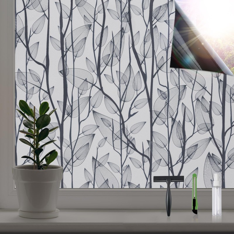 Leaf Pattern Window Tint with Installation Tools, Blackout Window Cover, Sun Blocking Window Tint for Home (Full Blackout Opaque, 17.7'' x 78.7'')
