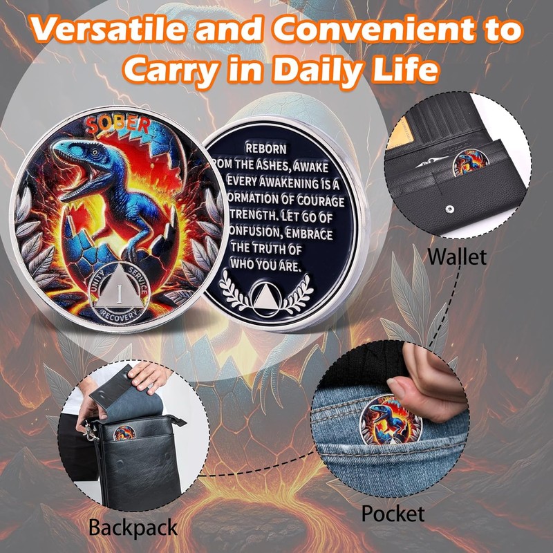 Leafence Sober Coin for Reborn Raptor Sobriety Chip Dinosaur Recovery Medallion with Inspirational Quote AA/NA Token (Reborn Dinosaur, 1 Year)